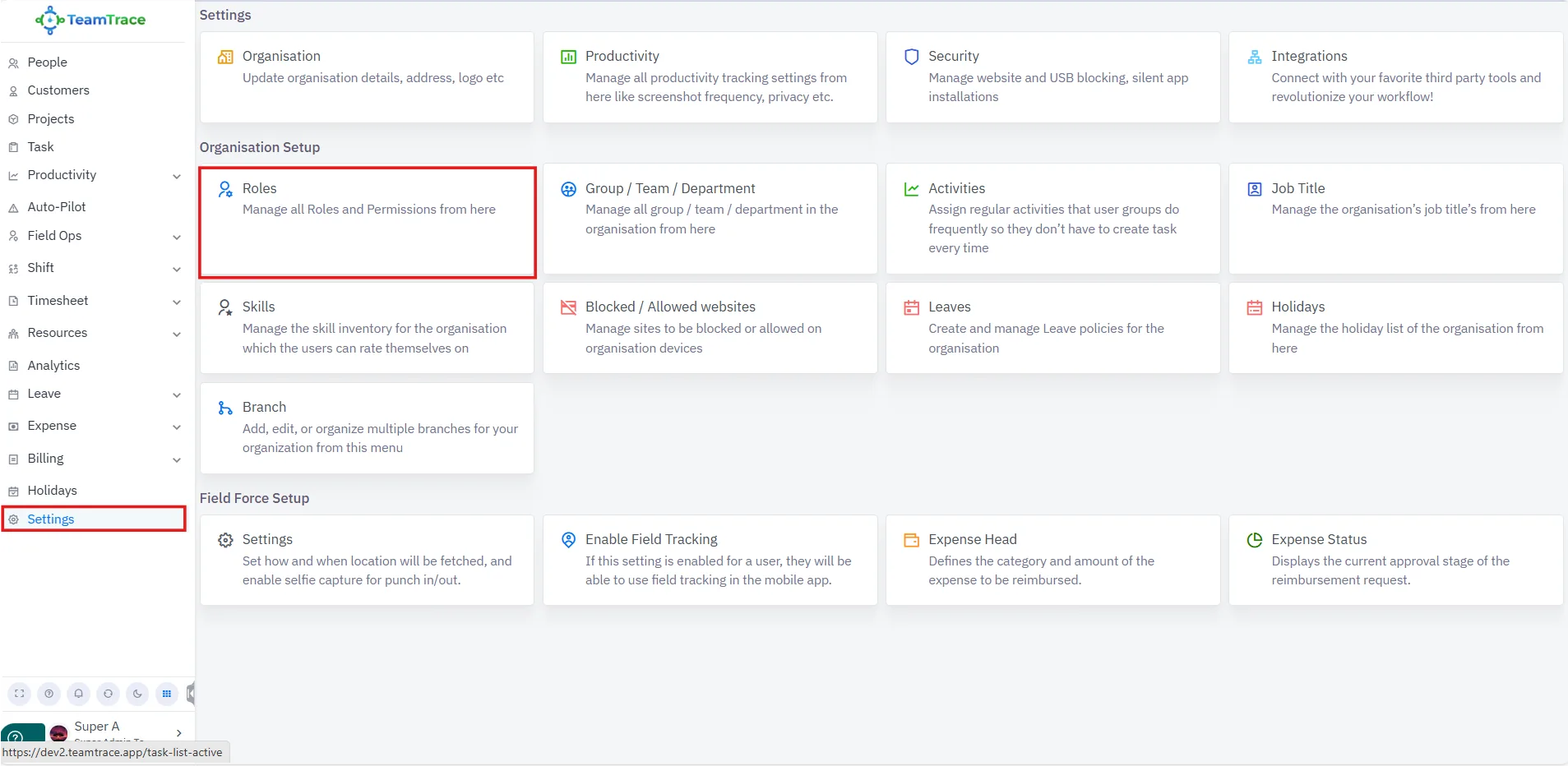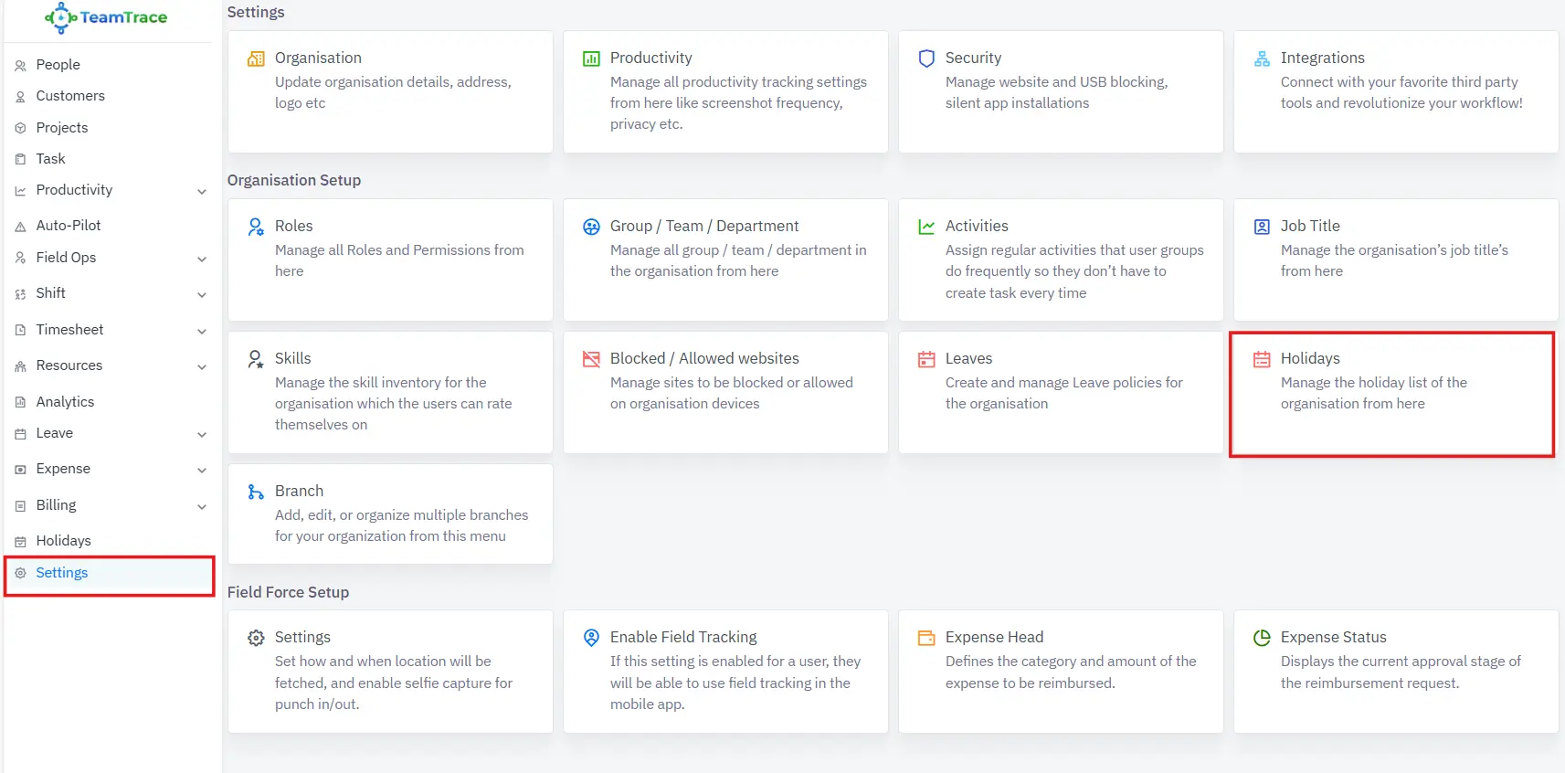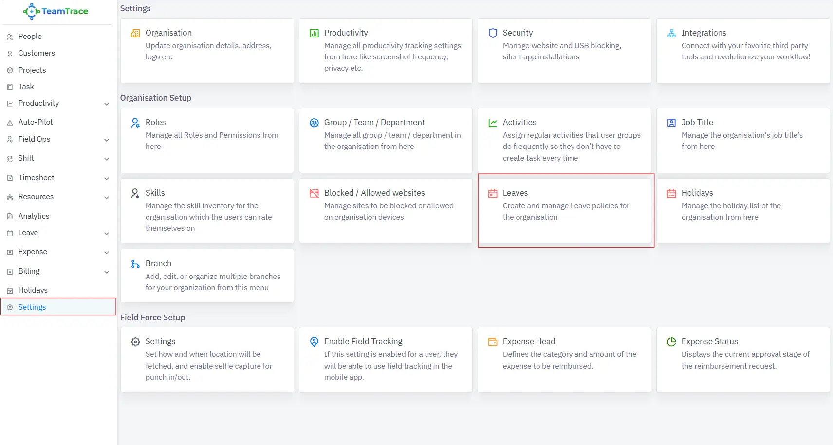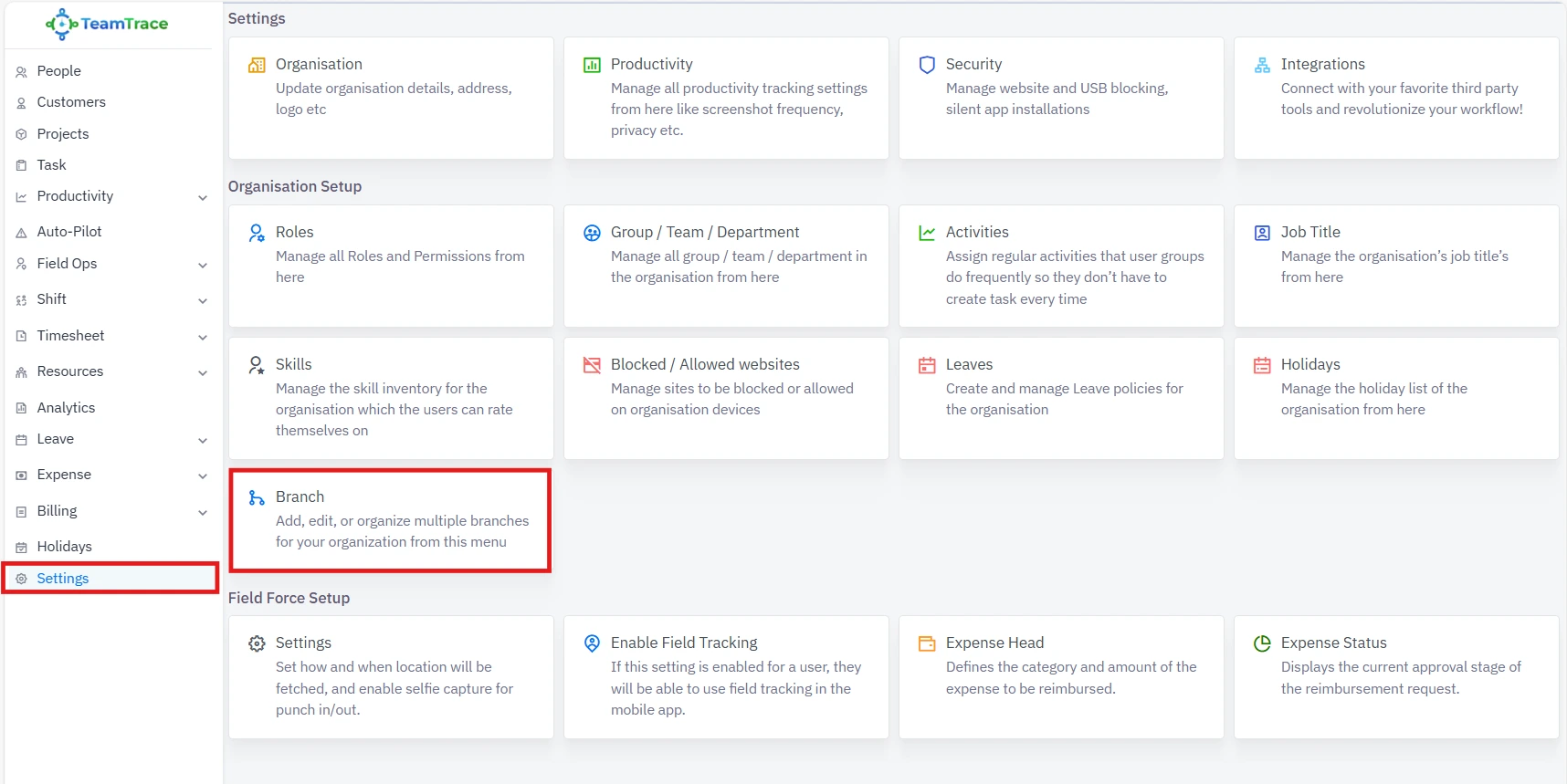 Log in to TeamTrace.app and navigate to Settings.
