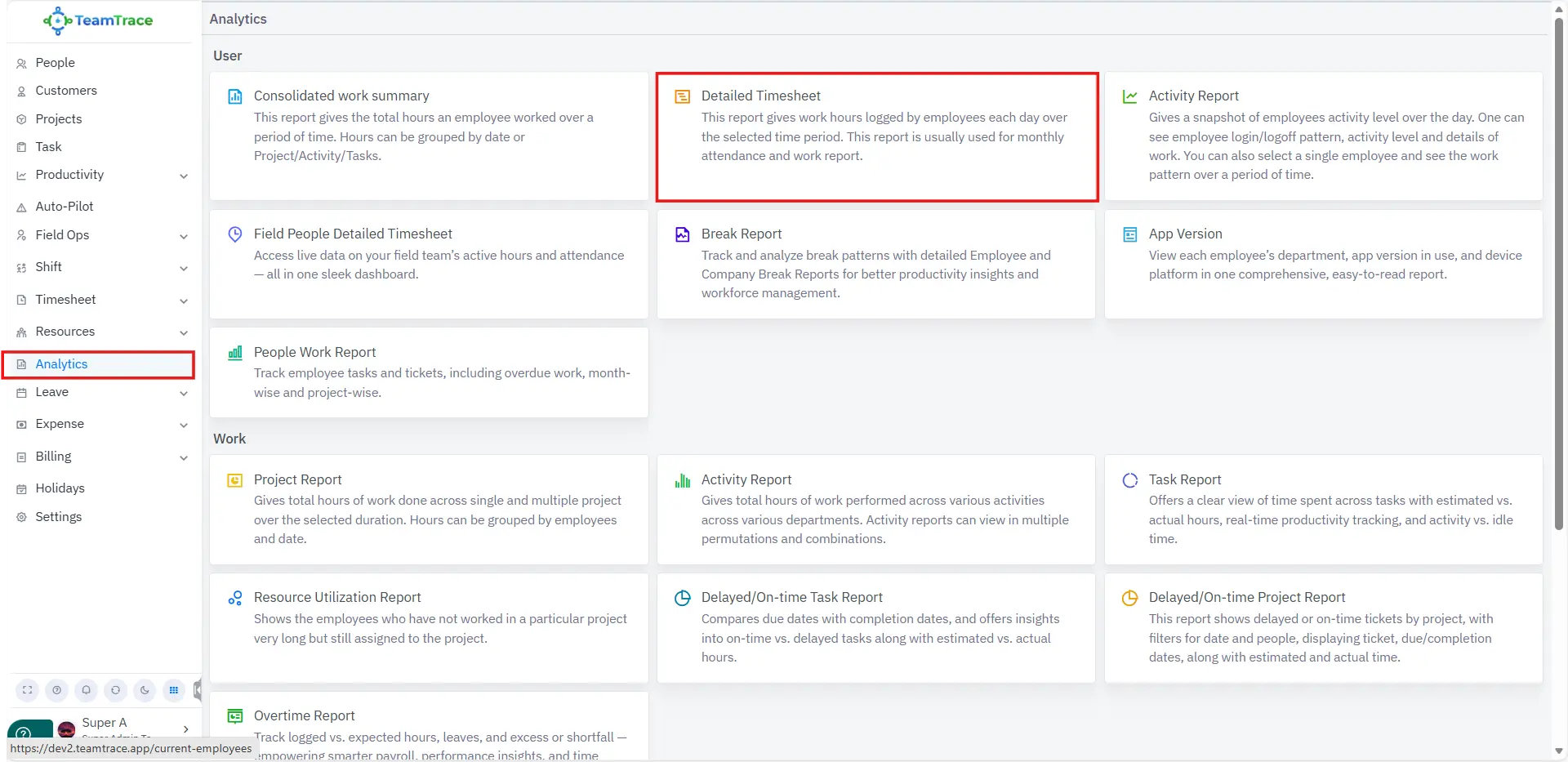 Analytics > User > Detailed Timesheet