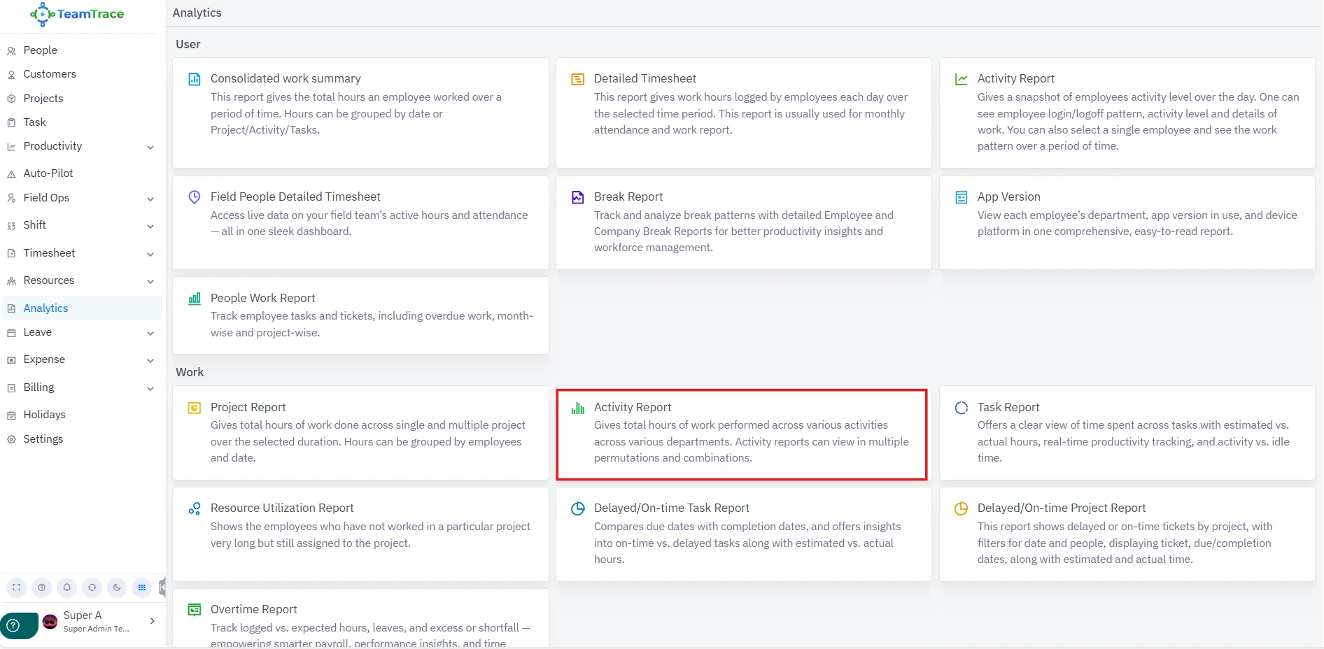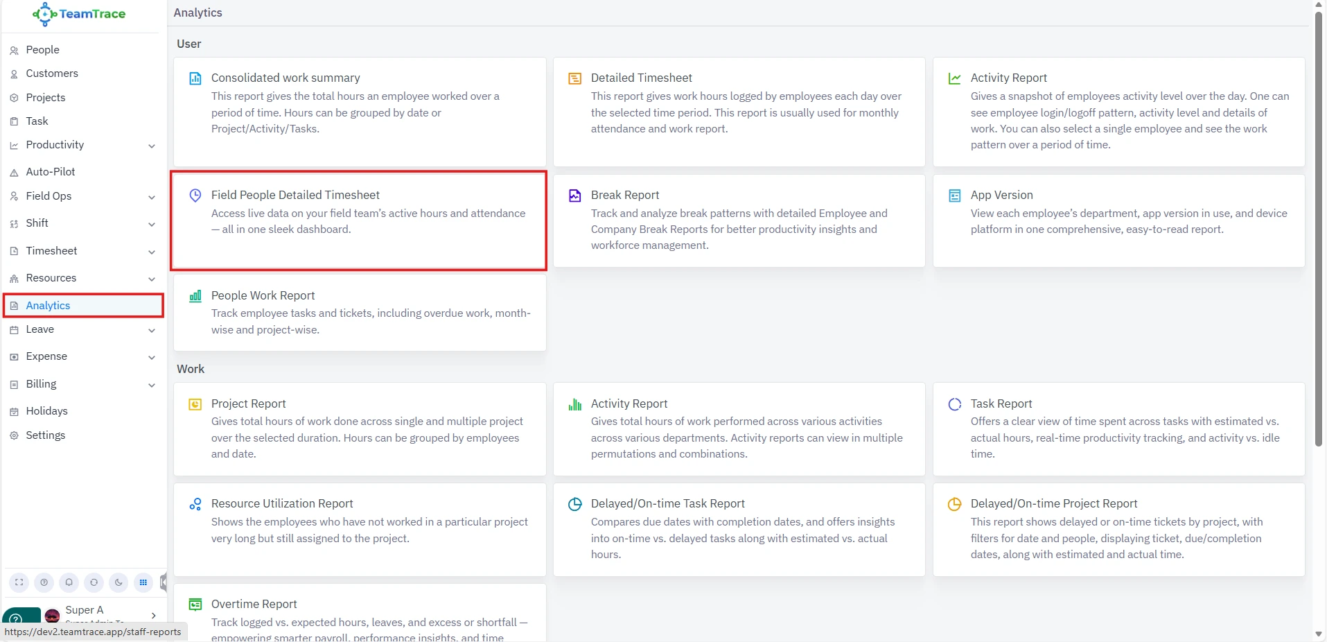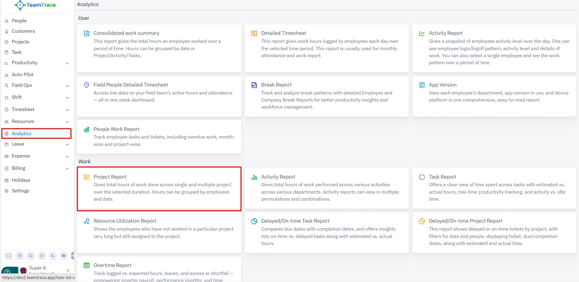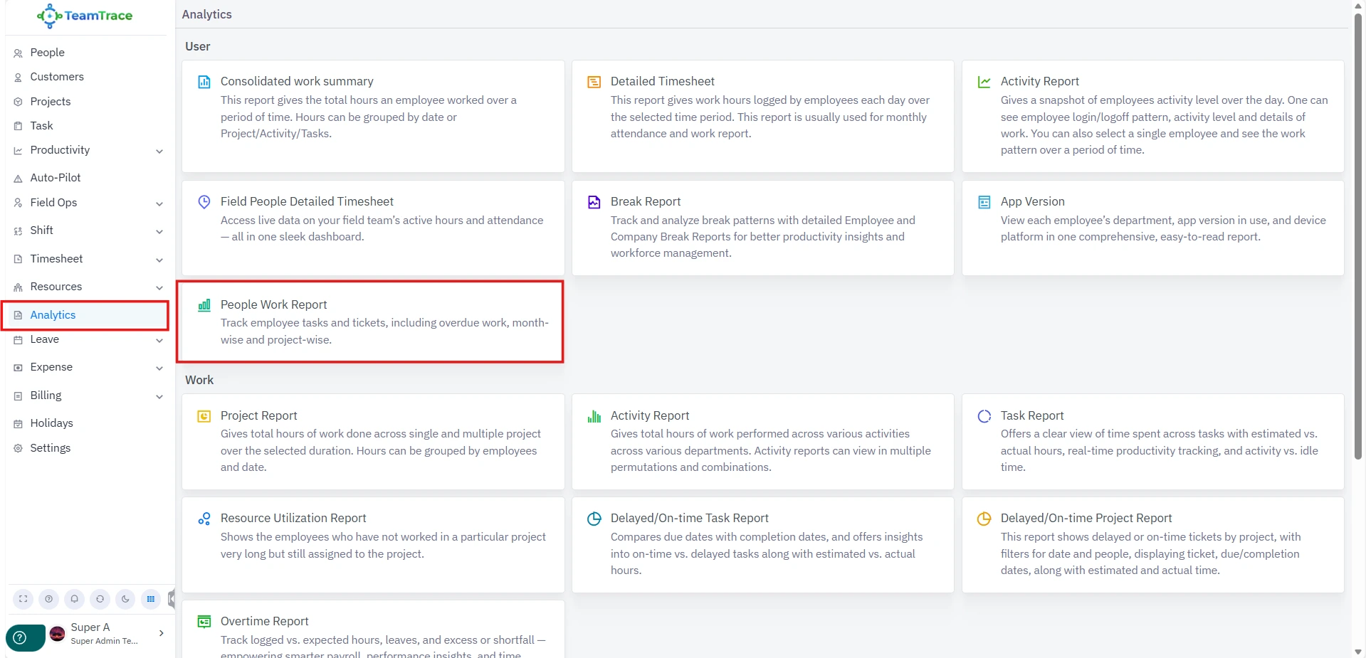 Analytics > User > People Work Report