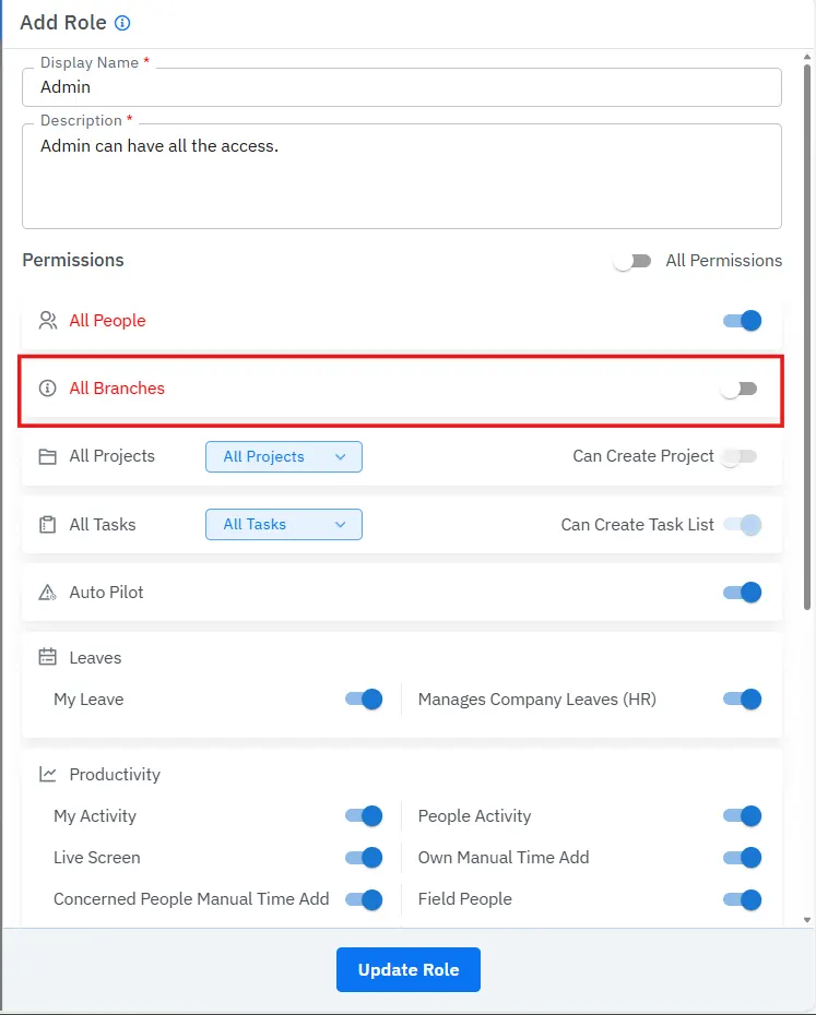 While creating or updating a role, you will now see an All Branches toggle.